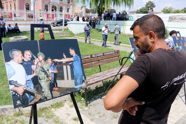 15 Temmuz Demokratik Gençlik Derneği ve AA Edirne Bölge Müdürlüğü iş birliğinde Selimiye Meydanı Fatih Sultan Mehmet heykeli çevresinde açılan sergide, AA muhabirlerinin FETÖ'nün hain darbe girişiminde bulunduğu gün ve sonrasında çektiği 40 fotoğraf yer alıyor. AA Edirne Bölge Müdürü Salih Baran, yaptığı açıklamada, Türk halkının direniş ve dirilişinin efsane fotoğraflarının halkın izlenimine sunulduğunu belirterek, bu tür hain girişimlerin, Türk milletinin kahraman duruşunun hafızalarda yenilenmesini ve genç nesillere aktarılmasını önemli bulduklarını söyledi.15 Temmuz Demokratik Gençlik Derneği Başkanı Veysel Güner de iş birliği adına Anadolu Ajansı'na teşekkür etti.Fotoğraflarda satırlara yazarak anlatılamayacak çok şeyin yer aldığını aktaran Güner, "Fotoğraflar her bir şeyi çok iyi anlatıyor. Kahraman halkımızın elinde bir taş bile olmadan hainlere karşı nasıl direndiğini anlatan çok iyi fotoğraflarımız var. Bu topraklarda bu girişimleri Allah bizlere yaşatmasın. Tekrar denemeye çalışırlarsa da biz dimdik Türk halkı olarak tekrardan buradayız. Hainlere tekrardan en iyi şekilde cevabı vermeye hazırız. Allah bir daha bizlere bu tür şeyleri yaşatmasın inşallah." diye konuştu.Serginin ardından aynı alanda Edirne Valiliği desteğiyle kurulan gönüllü memurlardan oluşan mehter takımı konser verdi."15 Temmuz Destanı Milli İradenin Yükselişi" sergisi hafta başına kadar gezilebilecek.
