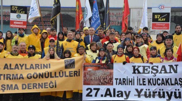 Saat 09.00’da başlayan törenden önce bir grup Şehitlik Anıtı’na giderek burada saygı duruşunda bulunarak Şehitliğe çiçek bıraktılar.Tekel Meydanı’ndaki törende ilk olarak konuşan Hikmet Sevim Yılmaz , “Keşan’ımızda bu geceyi geçirdik. Bize bu rahatlığı ve huzuru sağlayan, cepheye giderken bu huzurla cepheye yollayan 7 yıldır bizi misafir eden Keşan Belediye Başkanı Mehmet Özcan’a çok teşekkür ediyoruz. Bizi cephede de yalnız bırakmayan, cephede huzurlu bir şekilde savaşmamızı sağlayan, düşmana ilk kurşunu sıkan 27.Alayımızdı. Çanakkale Savaşlarının kaderini bu iki alay belirledi. Keşan Belediyemiz gerçekten bu anlamıyla, cephede bu yürüyüş esnasında bundan sonraki zorluğu bizden bedenimizden alıp, yüreğimize o serinliği veren belediyemiz, gerçekten çok teşekkür ediyoruz. Keşan’da bizleri yol boyunca alkışlayan, sokağa çıkıp bayrak sallayan, balkonlardan el sallayan Keşanlılara gerçekten çok çok teşekkür ediyoruz. Çok saygılar sunuyoruz. Bizlere destek veren tüm belediyelerimize ve kurumlarımıza teşekkürlerimizi iletiyoruz.”Yılmaz daha sonra 7 yıldan bu yana kendileri ile birlikte hareket eden Temsili 27.Alay Komutanı Keşan DOÇEK Başkanı Hakan Eşme’ye Liyakat Madalyası takdim etti.Daha sonra söz alan Aktan da şunları söyledi “ Değerli dostlar dün de söylediğim gibi Cumhuriyet kolay kurulmadı. Bu toprakların bağımsızlığı kolay kazanılmadı. Bugün burada özgürce bağımsızca yaşayabiliyorsak, 57.Alayların, 27.Alayların 15.Hava Hava bölüklerinin dönmemek üzere cepheye gitmeleri sayesinde yaşıyoruz. Bu alaylarımızın atalarımızı temsil eden arkadaşlarımıza çok çok teşekkür ediyoruz. Sağ olun, var olun yolunuz açık olsun” şeklinde konuştu.