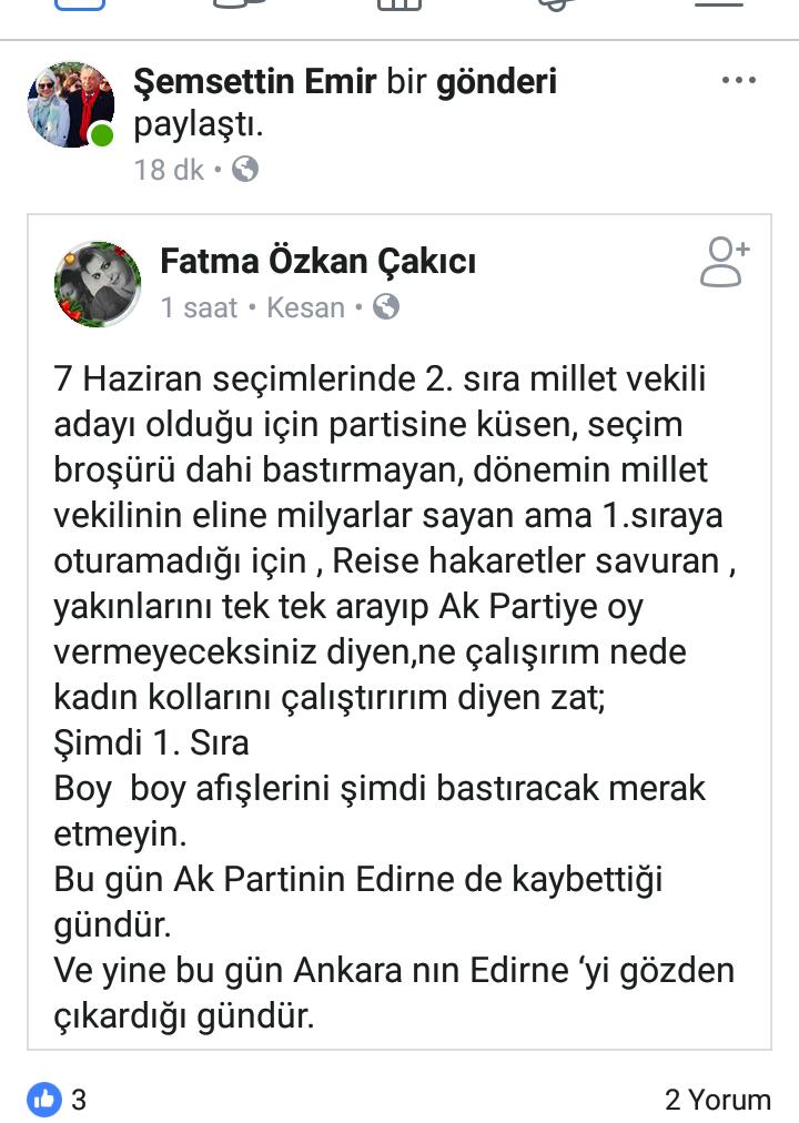 25. dönem AK Parti Edirne Milletvekili Şemsettin Emir’in 27. dönem AK Parti Edirne Milletvekili adayı Fatma Aksal hakkındaki yapılan bir paylaşımı sosyal medya hesabında paylaşması adeta şok etkisi yarattı. Yapılan paylaşımın Ak Partililer tarafından çok konuşulacağa benziyor.
