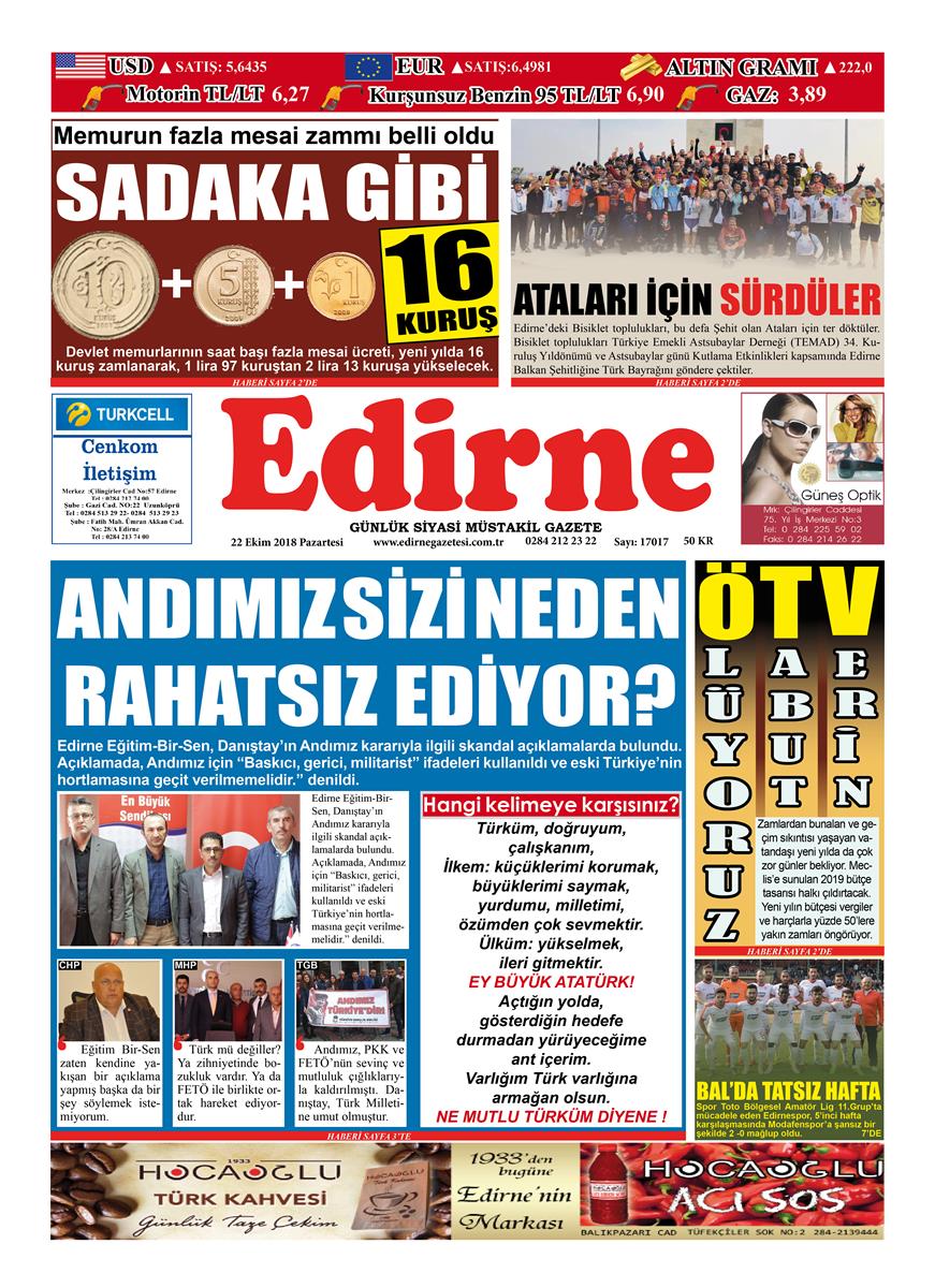 Edirne Eğitim-Bir-Sen, Danıştay'ın Andımız kararıyla ilgili skandal açıklamalarda bulundu. Açıklamada, Andımız için “Baskıcı, gerici, militarist" ifadeleri kullanıldı ve eski Türkiye’nin hortlamasına geçit verilmemelidir.” denildi.Eğitim-Bir-Sen Edirne Şubesi Andımız'la ilgili şok ifadeler kullandı. Şube Başkanı Erdinç Dalgıç tarafından yapılan açıklamada, Atatürk döneminde okunmaya başlanan Andımız'la ilgili, "Gerici, baskıcı, militarist, totaliter zihniyetin ürünü" ifadeleri kullanıldı.Yapılan skandal açıklamaya tepkiler çığ gibi büyüyor. CHP Edirne İl Başkanı Fevzi Pekcanlı, Ülkü Ocakları Genel Başkanı Olcay Kılavuz, Türkiye Gençlik Birliği Edirne İl Başkanlığı ve yüzlerce Edirneli gerek sosyal medya üzerinden gerekse basın açıklamalarıyla Eğitim-Bir-Sen Edirne Şube Başkanı Erdinç Dalgıç’ı ve açıklamayı destekleyen öğretmenleri kınadı.TÜRK MÜ DEĞİLLER?Geçtiğimiz gün MHP Edirne İl Teşkilatını ziyaret eden Ülkü Ocakları Genel Başkanı MHP Mersin Milletvekili Olcay Kılavuz, basın mensuplarının gündeme yönelik sorularını cevaplandırdı. Kılavuz, öğrenci andıyla ilgili Danıştay’ın verdiği kararın sevindirici bulduklarını belirterek, “Bu karardan rahatsız olanlar veya bu karardan korkanlar, andımızın okutulmasından dertlenenler, huzursuz olanlar acaba niçin böyle bir düşünce içine girerler? Türk mü değiller? Türklükle mi problemleri var? Bu millete karşı düşmanlıkları mı var? Bu duygu ve düşünceleri dile getiren her kimse zihniyetinde de ve kendisinde de bir bozukluk vardır. Ya da FETÖ ile birlikte ortak hareket ediyordur. Kimin siyasi görüşü ne olursa olsun yeter ki devletimize, milletimize, bayrağımıza, vatanımıza karşı saygılı olsunlar. Her hangi bir şekilde oyunun, planın, programın içinde olmasınlar.” açıklamasında bulundu.OKUTULMAMASI IZDIRAPTICHP Edirne İl Başkanı Fevzi Pekcanlı, Danıştay’ın Andımız ile ilgili kararını desteklediğini söyledi. Pekcanlı, “Andımızın 5 yıldır okullarımızda okutulmaması bir ızdıraptı. Danıştay çok yerinde doğru bir karar verdi. Türk Milleti'nin duygularıyla bu kadar oynamaya gerek yok. 5 yıl sonra Danıştay güzel bir karar verdi. Alınan kararı destekliyorum. Türkiye çapında Eğitim Bir-Sen genel bir açıklama yapmış. Eğitim Bir-Sen zaten kendine yakışan bir açıklama yapmış başka da bir şey söylemek istemiyorum."TÜRK MİLLETİNE UMUT OLDUTürkiye Gençlik Birliği (TGB) Saraçlar Caddesi PTT önünde Danıştay 8. Dairesinin verdiği Andımız kararını sevinçle karşıladı. TGB Edirne İl Başkanı Ata Ogün Kaplan, yaptığı basın açıklamasında, “Andımız, PKK ve FETÖ’nün sevinç ve mutluluk çığlıklarıyla kaldırılmıştı. Türk gençliğinin vatansever, milliyetçi ve Atatürkçü duygularını tahrip etmeye çalışan kuvvetler önce Andımıza saldırmışlardır. O dönem Türk gençliğinin kalbinde derin bir yara açmıştır. Gençliği milli kimliğinden koparma çalışmaları, emperyalist kuvvetlerin ve Türkiye düşmanlarının ekmeğine yağ sürmektedir. Danıştay’ın almış olduğu yerinde karar Türk Milletine umut olmuştur. İçerisinde bulunduğumuz terörle mücadele sürecinde verilen bu karar, cephede kahramanca savaşan Mehmetçiğimize moral olmuştur. Türk Milleti verilen bu kararla artık daha güçlü ve daha kararlıdır.”ifadelerine yer verdi.
