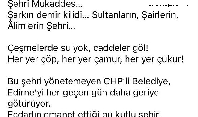 Cumhuriyet Halk Partisi (CHP)Edirne il Başkanı Yücel Balkanlı Fatih Mahallesi’nde yaşanan su taşkını nedeniyle sosyal medya üzerinden belediyeyi suçlayan Edirne milletvekili Fatma Aksal’ın mesajı ile ilgili açıklama yaptı.Balkanlı yaptığı açıklamada”Edirne’miz, bilgiye dayanmayan açıklamalar, sorumluluktan kaçan siyasi anlayış ve manipülasyonlarla hedef alınamaz.Fatih Mahallesi’nde yaşanan su patlaması ve taşkın üzerinden belediyemizi suçlamaya çalışan Edirne Milletvekili Fatma Aksal, her zaman yaptığı gibi sosyal medya üzerinden gerçeği çarpıtarak halkı yanıltmaya çalışmaktadır.Gerçek neden şudur;Fatih Mahallesi’nde meydana gelen patlama ve taşkın, Edirne Belediyesi’nin hatası değil,Devlet Hastanesi’nin kendi kuyusunda yürüttüğü çalışma sırasında yağmur suyu hattında oluşan tıkanıklık nedeniyle gerçekleşmiştir.Edirne Belediyesi olay anında müdahale etmiş, vatandaşlarımızın mağduriyetini gidermek için 24 saat aralıksız çalışmıştır.Buna rağmen bazı siyasi çevreler, özellikle AK Parti Milletvekili Fatma Aksal, hiçbir araştırma yapmadan belediyeyi hedef göstermeyi tercih etmiştir.Bu, Edirne’nin sorunlarını çözmek yerine, siyasi rant ve algı üretme çabasıdır.