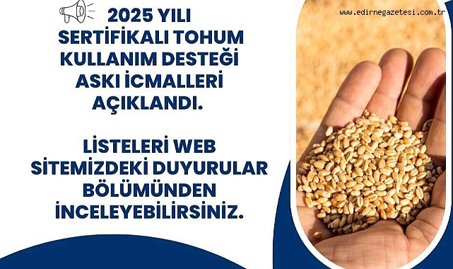 Edirne İl Tarım ve Orman Müdürlüğü'nden yapılan duyuruya göre 2025 yılı Sertifikalı Tohum Kullanım Desteği askı listeleri yayımlandı.