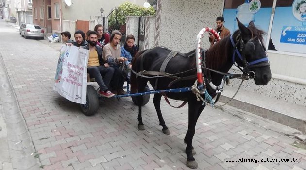 Sokakta Sanat Var Derneği, Kaleiçi Orhaniye Caddesi’nde basın açıklaması yapara belediyeye tepki gösterdi. Sokakta Sanat Var Dernek Başkanı Türkü Neval Köse, yaptığı açıklamada, “Sanatın en kapsamlı ayağını Edirne’de biz yürütüyor olmamıza rağmen bazı kurumlar tarafından hiçbir şekilde destek verilmiyor. Eğer ulaşımımız sağlanmazsa biz de kendi imkanlarımızla gideriz İstanbul’a. Bu yüzden de at arabasıyla yola çıkıyoruz. Yarın İstanbul’da görüşmek üzere” dedi. Edirne Belediyesi’ne İstanbul’da gerçekleşecek etkinliklere katılmak için ulaşım başvurusu yapan gençlerin istekleri reddedilince, gençler de at arabasına binerek İstanbul’a gitmekte buldu. Dernek üyeleri gençlerin, dernek binaları önünden hareket ederek İstanbul’a kadar at arabasıyla gidecekleri belirtildi.