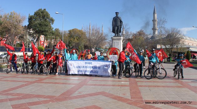 Gençlik Spor İl Müdürlüğü bisiklet antrenörü Zorlu Tuna “10 Kasım 2016 Atatürk’ü anma bisiklet turu. Cumhuriyetimizin kurucusu ulu önder Gazi Mustafa Kemal Atatürk’ün aramızdan ayrılışının 78’ci yıl döneminde, Atamızın sözü üzerine ben sporcunun zeki çelik aynı zamanda ahlaklısını severim sözünden yola çıkarak, bu gün Edirne’mizde Ulu Önder Atatürk’e saygı bisiklet turumuzu gerçekleştiriyoruz. Turumuzda Gençlik hizmetleri ve spor il müdürlüğü bisiklet branşı olarak çalışmalarını sürdürdüğümüz gençlik spor kulübü bisiklet takımı, aynı zaman proje kapsamında yürütümüz işitme engelliler grubu olarak Adnan Tunca İşitme engelliler okulu öğrencileriyle bu turu gerçekleştirmiş bulunmaktayız. Atamıza saygı bisiklet turunda bizlere destek olan Edirne Valiliği, Gençlik spor hizmetleri ve il müdürlüğü, İl milli eğitim müdürlüğümüz, Şehit öğretmen Adnan Tunca okulumuza teşekkürlerimizi sunuyoruz. Turumuzu 20 kişi olarak gerçekleştiriyoruz güzergâhımızda Saray spor tesislerinden başladı Atamızın huzurunda Atatürk heykeli önüne geldik Saraçlar Caddesi takiben 25 Kasım stadından tekrar tesisimize geri dönüş sağlıca. Bizleri bu gün yalnız bırakmayan Şehit öğretmen Adnan tunca işitme engelliler okulu, Gençlik spor bisiklet takımımıza teşekkür ediyoruz, ve gençlerimizi sporu yaymak adına çalışmalarımıza bekliyoruz” dedi.