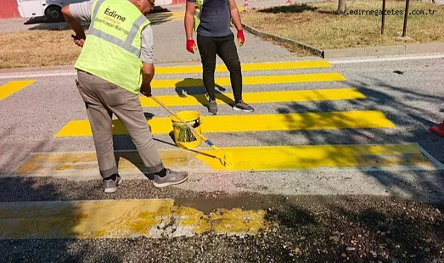 Edirne Belediyesi, kent merkezinde ‘sarı çizgi’ uygulamasını başlattı. Okulların açılmasına kısa bir süre kala, öğrencilerin güvenliği için okul çevresindeki yollar sarı çizgilerle boyanıyor.