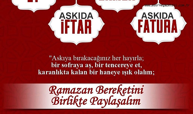 Edirne Belediyesi, Ramazan ayı boyunca toplumsal dayanışmayı güçlendirmek amacıyla “Askıda Dayanışma” uygulamalarını hayata geçirdi. Belediye tarafından yürütülen Askıda Et, Askıda Ekmek, Askıda İftar ve Askıda Fatura uygulamalarıyla ihtiyaç sahibi ailelere destek sağlanıyor.