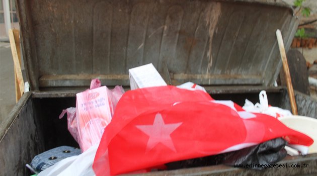 Çöp konteynerine, kimliği belirsiz kişi veya kişiler tarafından şeffaf bir poşet içinde Türk bayrağı atıldı.