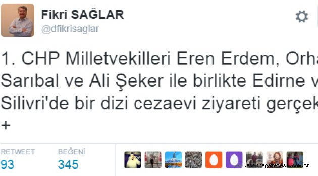 Diyarbakır Cumhuriyet Başsavcılığının yürüttüğü bir soruşturma kapsamında 4 Kasım'da tutuklanarak Edirne F tipi Cezaevi'ne konulan HDP Eş Genel Başkanı Selahattin Demirtaş'ı, CHP İstanbul Milletvekili Sezgin Tanrıkulu’nun ardından bir grup CHP Milletvekili Edirne’ye gelerek cezaevinde HDP’li siyasetçilerin yanı sıra Cumhuriyet yazarları ve yöneticileriyle de bir araya geldiler. CHP heyetinden Sağlar, Twitter’da yaptığı açıklamada ziyaret ettikleri isimleri şöyle sıraladı: CHP Milletvekilleri Eren Erdem, Orhan Sarıbal ve Ali Şeker ile birlikte Edirne ve Silivri'de bir dizi cezaevi ziyareti gerçekleştirdik.HDP Eş Genel Başkanı Selahattin Demirtaş, görevinden alındıktan sonra tutuklanan Mardin Eş Genel Başkanı Ahmet Türk, Cumhuriyet yazarları ve yöneticileri Akın Atalay, Murat Sabuncu, Kadri Gürsel, Turhan Günay Musa Kart, Güray Öz, Hakan Karasinir, Mustafa Kemal Güngör, Önder Çelik ve Bülent Utku.