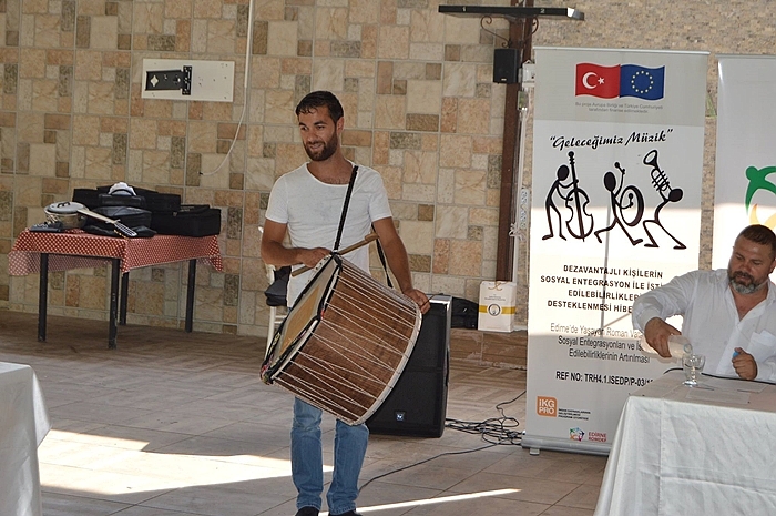 Roman Dernekleri Federasyonu ve Edirne Roman Müzisyenleri Yardımlaşma ve Dayanışma Derneği’nin ortaklaşa yürüttüğü “Geleceğimiz Müzik” son konuğu asma davul sanatçısı Samet Sertol oldu. Sertol; “Davul, zurna kültürü çok farklı bir kültür, bir sanat eseridir. Hiçbir zaman da ölmeyecek” dedi. Avrupa Birliği ve Çalışma Bakanlığı tarafından finanse edilen Roman Dernekleri Federasyonu ve Edirne Roman Müzisyenleri Yardımlaşma ve Dayanışma Derneği’nin birlikte yürüttüğü “Edirne’de Yaşayan Roman Vatandaşların Sosyal Entegrasyonları ve İstihdam Edilebilirliklerinin Artırılması” projesi “Geleceğimiz Müzik” kapsamında düzenlenen Rol Model Sanatçılarla Çalışma Atölyesi’nin sonuncusu ünlü asma davul sanatçısı Samet Sertol’un katılımıyla gerçekleştirildi. Sarayiçi’nde bulunan Ağa Köşkü’nde gerçekleşen “Rol model” atölye çalışmasında ünlü asma davul sanatçısı Samet Sertol genç müzisyenlerle tecrübelerini paylaştı. “DAVUL ZURNA HİÇBİR ZAMAN ÖLMEYECEK”Asma davulun görüldüğü gibi kolay bir alet olmadığına vurgu yapan Sertol, ritim çalmanın başka bir şey olduğunu belirterek, “Asma davul görüldüğü gibi sanıldığı gibi basit bir müzik aleti değildir. Bizler hep büyük üstatlarımızın yanında yetiştik. Rumeli TV’de başladım. Ondan sonra Latif Doğan ve değerli pek çok isimle çalıştım. Davul, zurna dediğimiz zaman bu kültürün kökeni Trakya’dır. Bu konuda Lüleburgaz özellikle en başta gelir. Davul, zurna kültürü çok farklı bir kültür, bir sanat eseridir. “GÜĞÜMLERLE, TENEKELERLE BAŞLADIK”Nasıl bir Türk Sanat Müziği ölmüyorsa, her zaman dinleniyorsa davul zurna da hiçbir zaman ölmeyecek bir kültürdür. Biz küçük yaşlardan beri hep büyüklerimizden bir şeyler kapmaya çalıştık. Bir Selanik Türküsü çalmayı öğrenmek için ustalarımızdan para almazdık, para vermeye çalışırdık. Bu kadar bizim için duyguludur. Biz küçük yaşlarda mahallelerde tenekelerle başladık. Arkadaşlarla toplanırdık. Kimimizin elinde bir güğüm, kimimizin elinde bir teneke. Davul bizim için büyük bir sevdadır. Çekirdekten gelmeyiz diyebilirim. Daha sonra babalarımızın davullarını alır, onları çalardık. Bizim için büyük bir sevda, büyük bir aşk oldu” dedi. “BİZ NOTA İLE YETİŞMEDİK”Eğitimin genç müzisyenler için çok önemli olduğunu belirten Sertol; “Biz nota ile yetişemedik. Alaylı yani kulaktan dolma, duygularımızla bir şeyler öğrenmeye çalıştık. Kulaktan dinleyerek, görerek yetiştik. Ama usuller var, vuruş usulleri var bunlar eğitimle öğrenilecek. Zamanımızda da bunları öğrenmek için imkânlar var. Bizim de hala çok öğrenecek şeyimiz var. Bizim için müzik sonsuzdur” şeklinde konuştu.