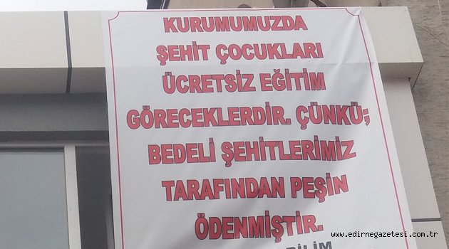 Ayşekadın’da bulunan bir eğitim merkezi eğitim sektöründe örnek bir davranışa imza attı. 10 gün sonra eğitim vermeye başlayacak olan eğitim merkezi kapılarını şehit çocuklarına ücretsiz olarak açacak. Eğitim Merkezinin duvarına asılan pankartta, “Kurumumuzda şehit çocukları ücretsiz eğitim göreceklerdir. Çünkü bedeli şehitlerimiz tarafından peşin ödenmiştir” ifadeleri yer aldı.Pankartı gören vatandaşlar duygulandıklarını belirterek, “Böyle bir uygulamayı takdir ediyoruz. Böyle duyarlılıkları herkesten bekliyoruz. Maddi durumları gerçekten iyi olan kişiler şehit ailelerini ve çocuklarını yalnız bırakmamalıdır. Unutmayalım ki yardım sadece maddi olarak yapılmaz. Şehit ailelerin yanlarında manevi olarak da bulunmalıyız. Biz eğer bugün yaşıyorsak şehitlerimize borçluyuz. Şehitlerimizin çocukları hepimizin çocuklarıdır. Bu pankart hainleri bir ders vermiştir. Türk Milletinin birlik ve bütünlüğünü hiç kimse bozamayacaktır. Eğitim Merkezinin de yapmış olduğu bu uygulama bizleri çok memnun etti” şeklinde konuştular.“TÜRK HALKI SAHİP ÇIKIYOR”Eğitim Merkezinin duvarına asılan pankart hakkında duygularını dile getiren Sezer Köseoğlu (22) Türk Halkının Şehitlerine ve ailelerine sahip çıktığını belirterek: “Türkiye ve Türkiye’de yaşayan herkes tedirgin ve de zor bir durumda. Akla kara, yaşla kuru karışmış bir şekilde normal yaşamlarına devam etmeye çalışıyor. İşte bizim bu ülke topraklarında rahatça yaşayabilmemiz için canlarını tereddütsüz ortaya atan şehitlerimiz var. Biz kırılmayalım, üzülmeyelim, bu topraklarda rahatça yürüyelim, yemeğimizi yiyelim, yatağımızda rahatça uyuyabilmemiz için kendi canlarını hiç düşünmeden gece gündüz tehlikeye atıyorlar. Bizler kendi ailelerimizin yanına sapasağlam gidebilmek için onlar kendi ailelerinin yanına gidemiyor. Benim ve herkesin onlara bir can borcumuz olduğuna inanıyorum. Şehit olan asker, polis, öğretmen, doktor vs. her kim insanlık için, diğer insanların rahat yaşayabilmesi için, ülkemiz için gözünü kırpmadan ölüme bile meydan okuyorlar. Allah yar ve yardımcıları olsun. Şehit olanlara rahmet Şehit ailelerine sabır ve selamet diliyorum. Şehit çocukları veya yakınları için yapılan bu uygulamayı ise ayrıca tebrik etmek lazım. Kendini bu insanlara borcu olanlar belki canlarıyla ödemiyorlar ancak borçlarını bu şekilde ödüyorlar. Şehitlerimiz biliyor ki vatan için bizler için hayatlarını kaybettiklerinde gözleri arkada kalmıyor. Emanet ettikler ailelerine Türk halkı sahip çıkıyor ve de gözü gibi bakıyorlar. Kimin emeği, fikri, teri varsa bu uygulamada hepsine helal olsun. İnşallah durumu iyi olan insanlar Şehit ailelerimize ve yakınlarına bu türden destekleriyle de yardım eder. Çok örnek bir davranış” dedi.