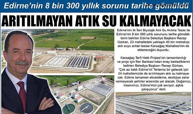 Edirne’nin ilk İleri Biyolojik Atık Su Arıtma Tesisi ile Edirne’nin 8 bin 300 yıllık sorununu tarihe gömdüklerini belirten Edirne Belediye Başkanı Recep Gürkan, 23 mahalledeki yaklaşık 40 bin metreküp atık suyu arıtan tesise Karaağaç Mahallesi’nin de ekleneceğini duyurdu.