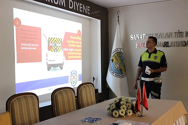 Edirne Emniyet Müdürlüğü Trafik Tescil ve Denetleme Şubesi tarafından Okul Servis şoförlerine bilgilendirme toplantısı gerçekleştirildi. Edirne Emniyet Müdürlüğü Trafik Tescil ve Denetleme Şube Müdürü Fahrettin Soydan; 2016-2017 Eğitim-Öğretim yılında Edirne’de sadece 1 Okul Servisi kazası meydana geldiğini belirterek yapılan ve yapılacak işlemler hakkında bilgi aktardı.
