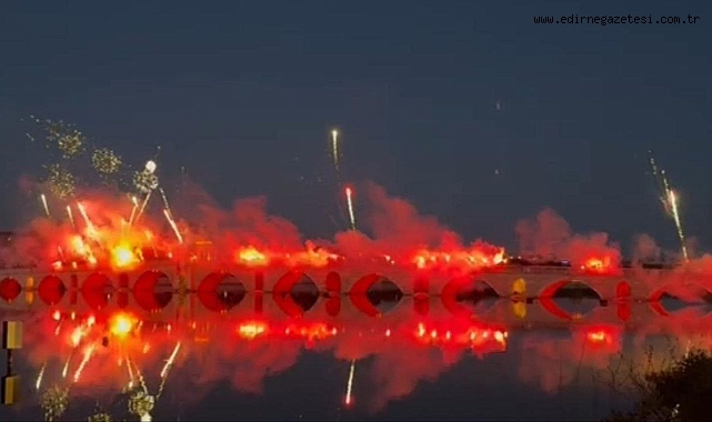 Pazar gecesi, Edirne Meriç Köprüsü’nde toplanan Galatasaray taraftarları, köprüye astıkları 5 yıldızlı bayrakla birlikte meşale yakarak görsel bir şölen sundular.