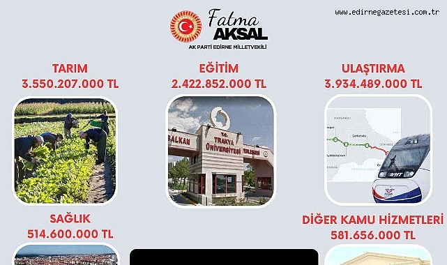 AK Parti Edirne Milletvekili Fatma Aksal, 2026 Yılı Kamu Yatırım Programı kapsamında Edirne’ye 11 milyar 3 milyon 805 bin TL tutarında yatırım ödeneği ayrıldığını açıkladı.
