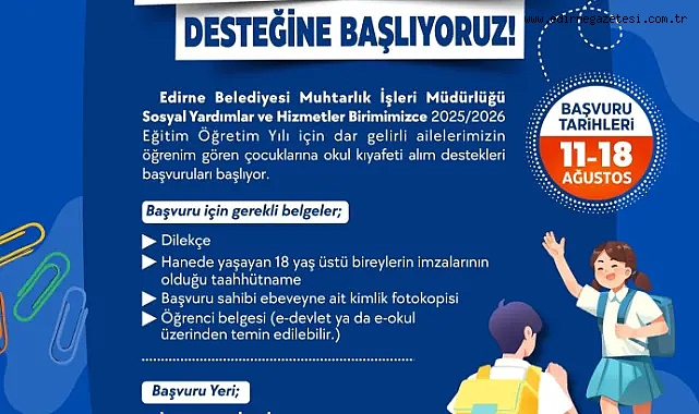 Edirne Belediyesi, yeni eğitim öğretim yılı öncesinde dar gelirli ailelerin çocuklarına yönelik önemli bir sosyal destek programını hayata geçiriyor. “Yarının umudu çocuklarımız için okul kıyafeti desteğine başlıyoruz!” sloganıyla başlatılan program kapsamında, ihtiyaç sahibi ailelerin çocuklarına okul kıyafeti alımı için yardım sağlanacak. Konuyla ilgili açıklamada bulanan Edirne Belediye Başkanı Av. Filiz Gencan Akın, “Yeni eğitim öğretim yılına girerken, dar gelirli ailelerimizin yükünü hafifletmek, çocuklarımızın okul kapısından başı dik, özgüveni yüksek bir şekilde girmesini sağlamak amacıyla okul kıyafeti desteğimizi başlatıyoruz. Eğitim yolunda tüm çocuklarımızın yanındayız.” İfadelerini kullandı.Edirne Belediye Başkanı Av. Filiz Gencan Akın’ın talimatları doğrultusunda başlatılan destek programı, Edirne Belediyesi Muhtarlık İşleri Müdürlüğü Sosyal Yardımlar ve Hizmetler Birimi tarafından yürütülerek 2025-2026 eğitim öğretim yılı öncesinde başlayacak. Başvurular, 11-18 Ağustos tarihleri arasında kabul edilecek. Başvuruda bulunmak isteyen vatandaşlar; dilekçe, hanede yaşayan 18 yaş üstü bireylerin imzalarının olduğu taahhütname, başvuru sahibinin ebeveynine ait kimlik fotokopisi ve öğrenci belgesi (e-Devlet ya da e-Okul üzerinden temin edilebilir) ile Babademirtaş Mahallesi, Çubukçular Hamam Skak No:17’de bulunan Edirne Belediyesi Muhtarlık İşleri Müdürlüğü Sosyal Yardımlar ve Hizmetler Birimi’ ne müracaat edebilecek.Yardımdan, yapılan sosyal inceleme sonucunda ihtiyaç sahibi olduğu Değerlendirme Kurulu tarafından tespit edilen aileler yararlanabilecek. Her ailede yapılan inceleme doğrultusunda, kriterlere uygun olan öğrenciler destekten faydalanabilecek.Ancak özel okullarda öğrenim gören öğrenciler, ana sınıfı ve açık öğretim öğrencileri bu yardıma programına dahil edilmeyecek. Ağustos Ayı Belediye Meclis Toplantısı’nda da konuyla ilgili duyuruda bulunan Edirne Belediye Başkanı Av. Filiz Gencan Akın, sosyal yardımlarda şeffaflık ve eşitlik ilkesine dikkat çekerek, “Her çocuğun eşit şartlarda eğitim alabilmesi bizim en temel önceliklerimizden biri. Eğitim; yalnızca bireyin değil, bir kentin ve bir ülkenin geleceğini şekillendiren en güçlü araçtır. Bu yüzden hiçbir çocuğumuzun yoksulluk nedeniyle eğitim hayatından geri kalmasına razı olamayız.Yeni eğitim öğretim yılına girerken, dar gelirli ailelerimizin yükünü hafifletmek, çocuklarımızın okul kapısından özgüveni yüksek bir şekilde girmesini sağlamak amacıyla okul kıyafeti desteğimizi başlatıyoruz. Eğitim yolunda tüm çocuklarımızın yanındayız.Biz Edirne Belediyesi olarak hiçbir zaman sorunlara kulak tıkayan, ihtiyaç sahiplerine sırtını dönen bir anlayışla hareket etmedik. Tam tersine; her koşulda vatandaşlarımızın yanında olmayı, özellikle çocuklarımızın ve gençlerimizin geleceğini korumayı görev bildik. Şeffaflık ve eşitlik ilkesine bağlı kalarak yürüttüğümüz destek programından faydalanmak isteyen vatandaşlarımızın belirtilen belgelerle ve tarihler arasında başvurularını yapmaları gerekmektedir.” İfadelerini kullandı. HABER MERKEZİ