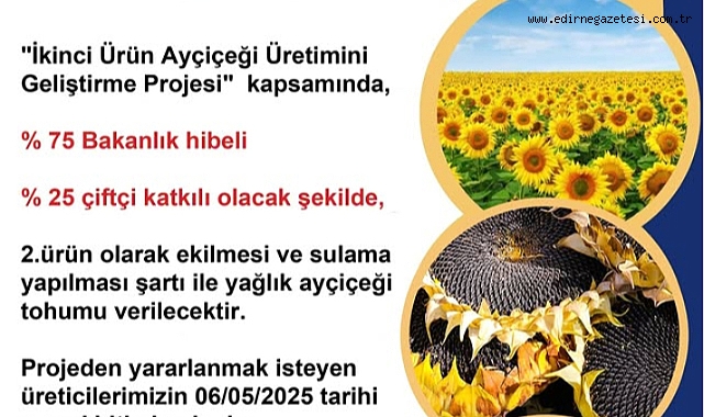 İkinci ürün ayçiçek üretimi yapacak olan üreticilere, tohum bedelinin yüzde 75’i devlet tarafından karşılanacak.