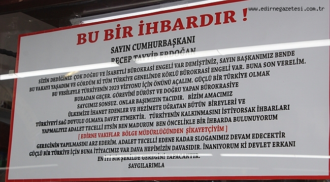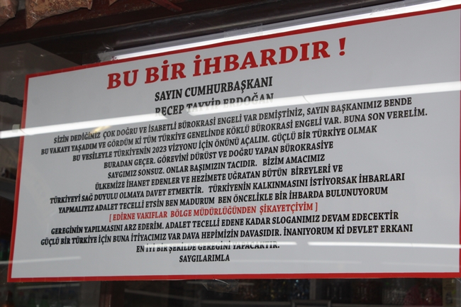 Edirne’de her gün binlerce yerli ve yabancı turistin gezdiği bedesten çarşısında bir esnaf Vakıflar Edirne Bölge Müdürlüğü tarafından haksızlığa uğradığını öne sürerek “Bu bir ihbardır” sloganıyla hazırladığı afişle Cumhurbaşkanı Erdoğan’a seslendi.Bedesten çarşısında işletme sahibi bir esnaf, Edirne Vakıflar Bölge Müdürlüğünden şikayetçi olduğunu belirterek Cumhurbaşkanı Recep Tayyip Erdoğan’a hitaben bir afiş hazırladı.Vakıflar Edirne Bölge Müdürlüğü tarafından mağdur edildiğini ifade eden esnaf, adaletin tecelli etmesi için bir ihbar mesajı yayınladığını söyledi.