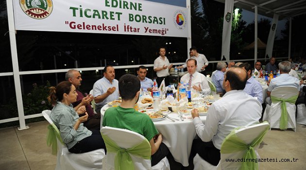 Her Ramazan ayında üyelerini ve personelini iftar yemeğinde buluşturan Edirne Ticaret Borsası, bu yıl da iftar yemeği verdi. Aslanlı Bahçe'de oruçlar okunan ezanla açıldı.ETB Başkanı Özay Öztürk’ün ev sahipliğini yaptığı iftar yemeğine Edirne Emniyet Müdürü Adnan Erdoğan Armağan, ETSO Yönetim Kurulu Başkanı Recep Zıpkınkurt, ETSO Meclis Başkanı Mehmet Eren, kamu kurum ve kuruluş müdürleri ve ETB üyeleri katıldı.Edirne Ticaret Borsası Başkanı Özay Öztürk, iftarda yaptığı konuşmada, "Ramazan ayı bizleri yüce Allah'a daha çok yaklaştırmakta, mutluluk ve huzurumuzu arttırmakta, sosyal dayanışma ve yardımlaşmada, daha başarılı kılmaktadır. Oruç tutmak kişiye olduğu kadar, topluma da çok yönlü mesajlar verir. Huzur, hoşgörü ve karşılıklı güvenin tesisini sağlar" dedi."Millet olarak en önemli gücümüz yardımlaşma ve dayanışma ruhudur" diyen Öztürk, "On bir ayın sultanı Ramazan ayı birlik, beraberlik ve paylaşmak demektir. Dostların ve ailelerin bir araya gelmesi, kucaklamasıdır. İşte biz de bu mübarek günde kocaman bir aile sofrasındayız. Büyük bir aileyiz. Birlik ve beraberlik içinde, şehrimizdeki tüm kurum ve kuruluşlarla kol kola girerek çalışmalarımızı sürdürmeliyiz. Sizlerin desteğini de arkamızda hissetmek bizlere güç vermektedir. Bu vesile ile mübarek Ramazan'ı şerifinizi kutluyor, ülkemiz ve milletimiz ve insanlık alemi için hayırlara ve affımıza vesile olmasını yüce Allah'tan niyaz ediyorum" dedi.