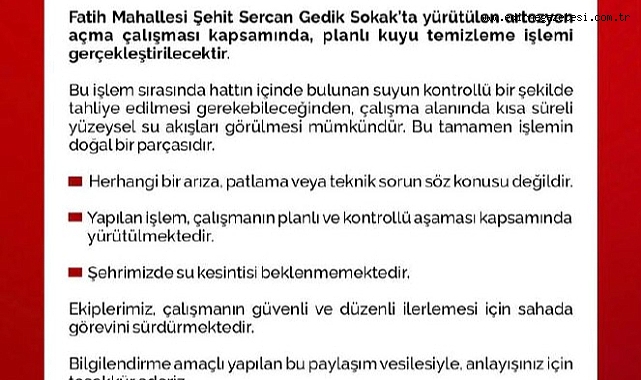 Belediye, söz konusu su hareketliliğinin bir arıza, patlama ya da teknik sorun olmadığının altını çizerek, işlemlerin tamamen planlı ve kontrollü şekilde sürdürüldüğünü vurguladı.