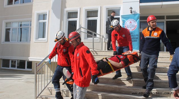 Edirne Milli Eğitim Müdürlüğü, Edirne İl Sağlık Müdürlüğü, Ulusal Medikal Kurtarma Ekibi (UMKE), Edirne Afet ve Durum Müdürlüğü (AFAD), Edirne Belediyesi İtfaiyesi ve Edirne Emniyet Müdürlüğü ekiplerince gerçekleştirilen deprem ve yangın tatbikatı nefes kesti. Tatbikatla ilgili açıklama yapan Edirne Afet ve Durum Müdürlüğü (AFAD) Ekip Amiri Sezgin Kaplan, "Bugün Edirne'de yıkıcı ve şiddetli bir deprem meydana gelmiştir. İlimizde bulunan tüm iletişim hatları kesilmiştir. İlk gelişen olaylar doğrultusunda İl Afet Acil Durum Müdürü Sayın Valimizi uydu telefonu aracılığı ile bilgilendirmiştir. Afet Acil yardım planından yer alan İlk kurtarma ve yardım komitesi sayın Valimiz başkanlığında, 112 Acil Çağrı Binası'ndaki AFAD Yönetim merkezinde toplanmıştır. Afet acil yardım planında yer alan ilk müdahaledeki görevlilerle, toplanma merkezine intikal edilmiştir. İlimiz Şükrüpaşa Mahallesi'ndeki TOKİ Mevki içerisinde yer alan, Edirne Akmercan Anadolu İmam Hatip Binası'nda ağır hasar meydana geldiği, okulda öğrencilerin bulunduğu AFAD Yönetim Merkezi'ne bildirilmiştir. AFAD yönetim merkezinden aldıkları talimatlar doğrultusunda Edirne AFAD Arama Kurtarma Müdürlüğü Arama Kurtarma Ekibi, UMKE, Edirne İl Emniyet Müdürlüğü'ne bağlı ekipler, Edirne Belediyesi itfaiyesi ekipleri, İl Sağlık Müdürlüğü'ne bağlı 112 acil servis ekipleri, arama kurtarma faaliyetleri için merkez Barutluk Mahallesi'ndeki TOKİ mevki içerisinde yer alan Edirne Akmercan Anadolu İmam Hatip Lisesi'ne hareket etmişlerdir. AFAD Merkezi'nden aldıkları talimatlar doğrultusunda Edirne Akmercan Anadolu İmam Hatip Lisesi'ne intikal eden arama ve kurtarma ekiplerimiz, olay mahallinde yaptıkları keşif ve incelemede, okul yönetimi tarafından deprem anında binanın kantin bölümünde hasar gördüğü, içerde bulunan tüpün patladığı ve sonrasında meydana gelen yangında binanın bir kısmının yıkıldığı ve yandığı, okul sınıflarda öğrencilerin yaralanarak mahsur kaldığı bilgisi alınmıştır. Ayrıca okul yönetimi yaşanan deprem ve patlama sonrasında okulun afet ve acil durumunda yer alan görevliler eşliğinde okul ikaz alarmı vererek, öğrencilerin büyük çoğunluğunu güvenli alanlara tahliyesini sağlamıştır. Ancak yaralanarak okulun üst katlarındaki sınıflarda mahsur kalan öğrencilerin kurtarılması gerektiği bilgisi alınmıştır" diyerek tatbikatı başlattı. Deprem ve yangın Acil durum senaryosu gereği merkez üssü Edirne Akmercan İmam Hatip Lisesinde meydana gelen deprem sonrası okulun bir bölümünde meydana gelen yangına müdahale eden itfaiye ekipleri, UMKE ve AFAD’la koordineli olarak okulda mağdur olan yaralı öğrencileri okul dışına sorunsuz bir şekilde nakil etti.Tatbikatta, yangın ve deprem durumunda öncelikle yangının söndürülme çalışmalarıyla birlikte ekipler tarafından önce kurtarıldı, sonra da tedavi edildi. Edirne İl Milli Eğitim Müdürü Hüseyin Özcan gerçekleşen tatbikat sonrası yaptığı konuşmasında; “Nerede ne zaman ne ölçüde ve ne türde olacağı bilinmeyen afetler dünya var olduğundan beri can ve mal kaybına neden olmaktadır. Doğal afetler kaçınılmazdır. Ancak gerekli önlemler alınarak ve uygun kurtarma ve müdahale yöntemleri kullanılarak afetlerin meydana getirdiği zararlar en aza indirilebilir.Depremleri önlemek mümkün olmadığından depreme hazırlıklı olmak, profesyonel kurtarma ve tıbbi müdahale hizmetleri sunmak oldukça önem arz etmektedir.1999 Marmara depremi ve akabinde ülkemizde yaşadığımız afetlerden elde edilen tecrübeler bizlerin afetlere karşı daha güçlü ve hazırlıklı olmamız gerçeğini, deprem öncesinde, sırasında ve sonrasında neler yapılmasını, nasıl davranılmasını çok iyi bilmemiz gerektiğini bir kez daha ortaya çıkarmıştır. Afete hazır bir toplum olmak, okullarda can ve mal güvenliğini sağlamak, eğitim sürekliliğini devam ettirmek, öğrencilerimizin afetlerden en az etkilenmesi için elimizden geleni yapmaya devam edeceğiz.Bugün burada icra ettiğimiz tatbikatın ana hedefleri arasında kurumların yeteneklerini test etmek, kurumsal ve teknik kapasiteyi artırmak, okullarımızdaki sivil savunma servis ve hizmet gruplarının eğitimini sağlamak, İl Milli Eğitim Müdürlüğümüzün kurumlar arasındaki işbirliği, koordinasyon ve birlikte çalışma kültürünü geliştirmek ve test etmek yer almaktadır.Her an her duruma hazır olmak gerekmektedir, hazırsanız bir an bile beklemezsiniz, bir an bile gözünüzü kırpmazsınız, hazırsanız hiçbir engel sizi durduramaz ve hazırsanız korkmazsınız.İl Millî Eğitim Müdürlüğümüzün Okul Deprem ve Personel Tatbikatına destek veren; İl Afet ve Acil Durum Müdürlüğü, İl Emniyet Müdürlüğü, İl Sağlık Müdürlüğü ve Edirne Belediyesi İtfaiye Teşkilatına katkılarından dolayı teşekkür ederim. Bu vesile ile ülkemizde meydana gelen depremlerde hayatını kaybeden vatandaşlarımızı rahmetle anıyor, bir daha böyle afetlerle karşılaşmamayı temenni ediyorum” dedi.Başarılı geçen tatbikata öğrencilerin ve çevre halkının ilgisi büyük oldu. Ayrıca öğrencilere AFAD personeli tarafından araçların tanıtımı yapılarak broşür dağıtıldı.