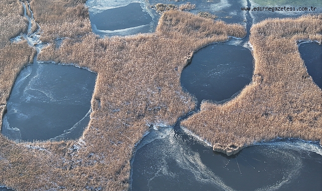 Edirne'de Göl Baba sulak alanının büyük bölümü, dondurucu soğukların etkisiyle buzla kaplandı.