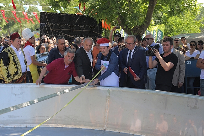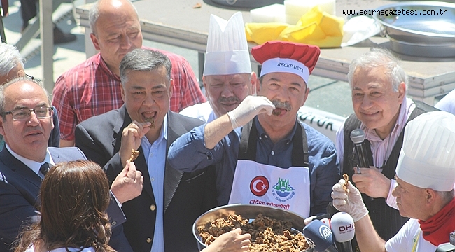 “SENİ SEVİYORUZ EDİRNE”Rekor denemesinde Guinness Rekorlar Kitabı Türkiye Temsilcileri Prof. Orhan Kural ve Aydın Türkgücü yer alırken; gözlemci olarak da Mimar Elif Uras, Mimar Emine Yaravlı, Gıda Mühendisi Kadir Süzme ve Hijyen Uzmanı Ezgi Özkan bulundu. Edirne’de sabah saatlerinden itibaren rekor denemesi için hummalı bir hazırlık başladı. İlk olarak tavanın ateşi yakıldı. Ateş için 12 ton odun, 3 ton da kömür yakıldı. Daha sonra Guinness Rekorlar Kitabı Türkiye Temsilcileri tarafından tavanın metre ile ölçümleri yapıldığı ve bunlar hem kamere hem de fotoğraf ile belgelendi. Ölçümüm tamamlanmasından sonra paslanmaz saçtan imal edilen tava; vinçle rekor denemesine tanıklık eden Edirnelilerin alkışları eşliğinde tavanın ısıtılacağı platforma oturtuldu. 2 bin 520 litre Ayçiçek yağının kullanıldığı rekor denemesinde; tavanın sıcaklığının 180 dereceye gelmesi beklendi. Tavanın sıcaklığı 180 dereceye yükseldiğinde Edirne, bir rekor denemesine tanıklık etti. 600 kilo ciğer; Edirne Belediye Başkan Recep Gürkan ve ciğer ustaları tarafından tavaya salındı. Dünyanın en lezzetli ciğerinin Edirne’de olduğunu ifade eden Edirne Belediye Başkanı Recep Gürkan; rekor denemesine katkıda bulunan herkese teşekkür etti. Dünyanın en lezzetli ciğerinin dünyanın en büyük tavasında pişmesi gerektiğini belirten Gürkan, rekor denemesinin Guinness Rekorlar Kitabı tarafından onaylanmasının ardından tavanın, ciğer ve ciğer ustasının yer aldığı heykelle birlikte sergileneceğini söyledi.Gürkan, “hem Edirne’nin hem de eşsiz lezzetin tanıtımını tün dünyada gerçekleştireceğiz. Bizler hep inandık, çabaladık, uğraştık, didindik; Edirne'miz için en güzeli, en iyisi ne olacak ise onu istedik. Şimdi görüyorum ki çabalarımızın karşılığını en güzel şekilde alıyoruz. Bizler Edirne için, sizler için varız. Edirne büyüksün, seni seviyoruz Edirne” dedi. Pişirilen ciğer daha sonra Edirne Halkı’na ikram edildi. BANDOLARA YOĞUN İLGİ8. Uluslararası Edirne Bando ve Ciğer Festivali kapsamında yurtiçi ve yurtdışında gelen bando ekipleri; tarihi Meriç Köprüsü’nde rengarenk bir görüntü sergilerken, katılımcılar bandoların performanslarını cep telefonu ve fotoğraf makineleriyle bu anları ölümsüzleştirdi. Ciğer Festivali’nin 2. ve 3. gününde bando ekiplerinin gösterileriyle devam etti. Karaağaç yolu üzerine Dünyanın En Büyük Tavası’yla Guinness Rekorlar Kitabı için yapılacak olan rekor denemesi öncesinde; yurtiçi ve yurtdışından festivale katılan 12 bando ekibi; tarihi Meriç Köprüsü’nden geçit yaptı. Bu esnada köprü üzerinde renk cümbüşü yaşandı. Yaşanan bu renk cümbüşüne; bando ekiplerinin çaldığı muhteşem parçalarda eşlik etti. Edirneliler ise bu anı telefonlarıyla görüntüledi. Ekiplerin geçişi sırasında Meriç Köprüsü bir süreliğine trafiğe kapatıldı. Dün saat: 14.00’te Saraçlar Caddesi’nde festivale katılan Bando Ekipleri, Edirnelilere konser verdi.