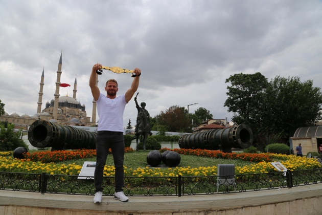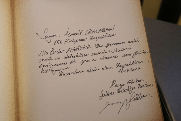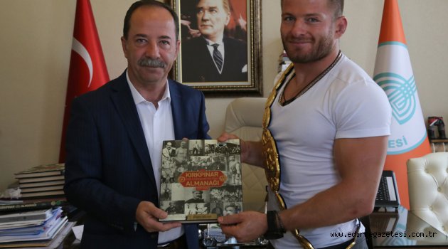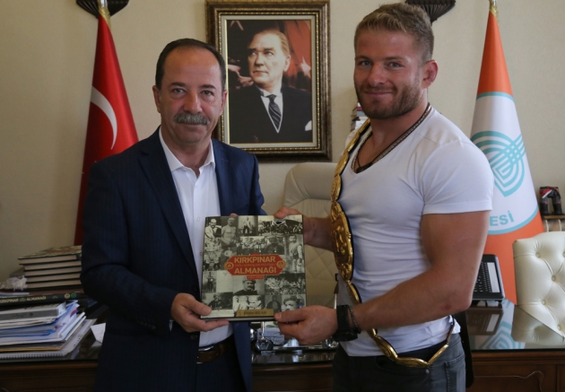 Edirne Belediye Başkanı Recep Gürkan, 656. Kırkpınar Yağlı Güreşleri’nin Başpehlivanı İsmail Balaban’a Edirne Belediye Başkanlığı’nın, 1361 yılından bu yana 656 yıldır aralıksız sürdürülen Tarihi Kırkpınar Yağlı Güreşleri'nin tüm bilgilerini bir araya getirdiği Kırkpınar Almanağını hediye etti. 656. Kırkpınar Yağlı Güreşleri’nde rakibi Orhan Okulu’yu finalde yenerek, altın kemerin sahibi olan İsmail Balaban, memleketine dönmeden önce Edirne Belediye Başkanı Recep Gürkan’ı ziyaret etti.Başkanlık Makamı’nda gerçekleştirilen ziyarette konuşan Edirne Belediye Başkanı Recep Gürkan, 656. Kırkpınar’ın yaklaşık 10-15 yılın en nitelikli güreşlere ev sahipliği yaptığını söyledi. 656. Kırkpınar Yağlı Güreşleri’nde güreş seyircisinin de hep özlediği, arzu ettiği kıran kırana güreşlerin gerçekleştiğini ifade eden Gürkan, “Bu mücadeleyi bütün boylarda, bütün derecelerde gördük. Yağlı güreşlerin ruhuna ve felsefesine uygun: akıllarda en küçük bir şüphe dahi bırakmayacak bir nitelikte, kalitede tertemiz pırıl pırıl güreşler yapıldı” dedi. KIRKPINAR ÇAYIRI HER PEHLİVANIN ARZUSUKırkpınar Yağlı Güreşleri’nin dünyanın en büyük yağlı güreş organizasyonu olduğunu ifade eden Gürkan, “Unesco Dünya Kültür Mirası Listesi’nde yer alan; yağlı güreşlerin olimpiyatı olan Kırkpınar; Kırkpınar Çayırı ve Kırkpınar Başpehlivanı olmak yağlı güreş yapan her pehlivanın hayali, arzusu. İsmail Balaban dün bütün turlarda 6 tur güreş yaptı. Bütün turlarda puanla değil, yenerek kazandı. Kırkpınar’a çok yakışan güreşlerle çok yakışan bir başpehlivan oldu. Türkiye’nin başpehlivanı oldu. İnşallah temennimiz odur ki; bu başarısını sürdürür, bu çalışmasını sürdürür ve altın kemeri; cuma günü Seyfettin Selim’e ağalık altın kemerini ebedi olarak taktığım gibi, belediye başkanlığım dönemimde İsmail Balaban’a altın kemeri ebedi sahibi olarak takarım” diye konuştu. KIRKPINAR’DA TARİHİ REKORKırkpınar’a pehlivan katılımı sayısında her yıl rekor tazelediklerini ifade eden Başkan Gürkan, “Göreve geldiğimizde bin 924 pehlivan ile başlamıştık. Geçen yıl pehlivan sayısı bin 969 oldu. Bu yıl 2 bin 200 pehlivan Kırkpınar’a katıldı. Bununla gurur duyuyoruz ama şunu da tartışmamız gerekiyor; yıl içerisinde hiçbir performans göstermeyen, başarılı olamayan pehlivan Kırkpınar Çayırı’na çıkmalı mı çıkmamalı mı? Çünkü o zaman biz güreşleri yarım saate sığdırmak zorunda kalıyoruz. Puanlamayı 5 dakikaya sığdırmak zorunda kalıyoruz. Oysa bu yıl izlediğimiz gibi bazen ben hatta bir ara Sayın Gençlik Spor Bakanı Akif Çağatay Kılıç’a espri yaptım; korkarım başpehlivanlık güreşi bitecek ama başaltı güreşi bitmeyecek. O kadar uzadı ki. Şimdi o zaman bizim Kırkpınar ve Türkiye’deki yağlı güreşlere bazı kısımlarına yeni bir şekil vermemiz, disiplin etmemiz gerekiyor. Ama bu yağlı güreşin oyununa, ruhuna, felsefesine, geleneklerine dokunmamak gerekiyor” şeklinde konuştu. Türkiye’de 100 ile 120 arasında yağlı güreşin yapıldığını ve bu güreşlerin yüzde sekseninden fazlasını belediyelerin gerçekleştirdiğini ifade eden Gürkan, yeni kurulan Yağlı Güreş Düzenleyen Kentler Birliği ile öncelikle büyük güreşlerin tarih çatışmalarını önlemek gerektiğini anlattı.Her organizasyonun farklı tarihlerde olması gerektiğini belirten Gürkan, “Ve akabinde yıl içerisinde pehlivanlarımızın tüm boylarda katıldıkları güreşlerin istatistiklerini tutmamız gerekiyor. Onları derecelendirmemiz gerekiyor. Kim kaç güreşte ne kadar başarılı olmuş ne kadar kürsü yapmış, kaç tur atlamış, kaç yenilgi almış, kaç kez yenmiş? Ve sonuç itibari ile bunların tümünü yağlı güreşin olimpiyatı olan Kırkpınar’da da sonucunu görmemiz gerekiyor. Ben İsmail Balaban’ı tekrar kutluyorum. Allah güç kuvvet versin, Allah derman versin. Başarıları daim olsun. Altın kemerin de ebedi sahibi olsun” dedi.Edirne Belediye Başkanı Recep Gürkan’a teşekkür eden Balaban da “Kendime güvenerek sahaya çıktım. Hedefim altın kemeri kuşanmaktı. Hedefime ulaştım” sözlerine yer verdi.Trakya Üniversitesi’nden kendisine yüksek lisans yapması için teklif geldiğini belirten Balaban bu teklifi kabul edeceğini söyledi.Gürkan daha sonra Balaban’a Edirne Belediye Başkanlığı’nın, 1361 yılından bu yana 656 yıldır aralıksız sürdürülen Tarihi Kırkpınar Yağlı Güreşleri'nin tüm bilgilerini bir araya getirdiği Kırkpınar Almanağı’nı hediye etti. Gürkan, Balaban için imzaladığı almanakta şunlara yer verdi: “Sayın İsmail Balaban; 656. Kırkpınar Başpehlivanı, Ulu Önder Atatürk’ün ‘Ben sporcumum zeki, çevik ve ahlaklısını severim’ sözünü benimsemiş bir sporcu olmanızı canı gönülden kutluyorum. Başarıların daim olsun pehlivan”