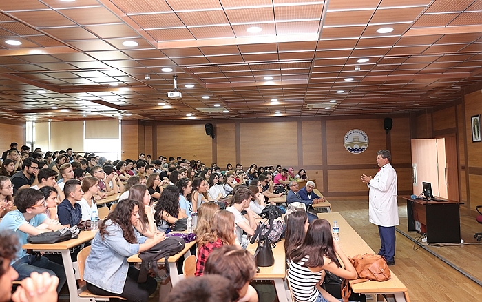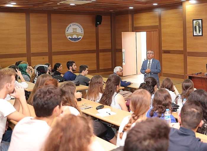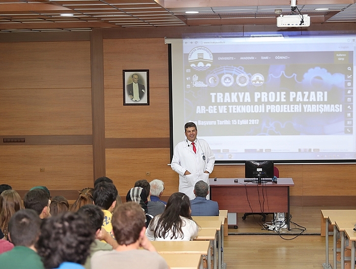 Tıp öğrenimine gerçekleştirilen “Beyaz Önlük Töreni” ile başlayan Trakya Üniversitesi Tıp Fakültesi öğrencilerine 2017-2018 Eğitim-Öğretim Yılının ilk dersini Rektör Vekili Prof. Dr. Cem Uzun, Uyum Programı kapsamında 12 Eylül 2017 tarihinde Ratip Kazancıgil Derslik Binasında verdi. Derste Tıp Fakültesi Dekanı Prof. Dr. Ahmet Muzaffer Demir de bulundu.Prof. Dr. Cem Uzun “33 sene önce ben de sizler gibi tıp eğitimine başladım. Sizler Trakya Üniversitesini seçen şanslı öğrencilersiniz. Hepinize hoş geldiniz diyor bundan sonraki eğitim hayatınızda da başarılar diliyorum” diyerek söze başladı. Ardından Edirne’yi ve üniversiteyi öğrencilere tanıtan Rektör Vekili Edirne’nin tarihte tıp eğitimi alanında önemli bir yeri olduğunu söyleyerek II. Bayezid Külliyesi’nin öneminden bahsetti. Rektör Vekili, zamanının en önemli eğitim ve sağlık kurumu olan ve şu anda üniversiteye bağlı Sağlık Müzesi olarak varlığını devam ettiren bu önemli eserin öğrencilerimiz tarafından mutlaka ziyaret edilmesini istedi.Tıp biliminin sürekli geliştiğini ve buna göre hekimlerin de kendilerini sürekli güncel tutmalarının gerekliliğine değinen Prof. Dr. Cem Uzun üniversitenin bu amaçla yaptıklarından bahsederek üniversitenin kütüphanesinin 7/24 açık olduğunu vurguladı ve öğrencilerden buradan faydalanmalarını istedi. Öğrencilerden her zaman not tutmalarını isteyen Rektör Vekili “Kalem ve kâğıdın yerini alan bir teknoloji yok. Hocalarınızla konuşurken sürekli not tutun. Bunlar sizin düşüncelerinizi şekillendirecektir. Bizim dileğimiz sizin en iyi eğitimi almanız. Bunun için sizin düşünceleriniz de önemli. Empati yapmanızı öneririm. Karşınızdaki hastayı bir yakınınız gibi düşünün. Anneniz, babanız, kardeşiniz gibi. Onlar için nasıl bir tedavi istersiniz. Onlar için nasıl bir hekim istersiniz. Bunu düşünün ve ona göre çalışın. Bu sizi en iyi hekim yapacaktır” diyerek sözlerine devam etti.Edirne’de medeniyetimizin izlerinden bahseden Rektör Vekili Prof. Dr. Cem Uzun Osmanlı’dan gelen bilim ve tıp eğitimi geleneğinin üniversitede devam ettiğini söyleyerek üniversitenin kalite ve akreditasyon çalışmalarına değindi. Prof. Dr. Cem Uzun “Hocalarımızın desteği ile akreditasyon çalışmalarımız tamamlanıyor. Çok kısa bir süre sonra uluslararası akreditasyon sahibi olacağız. Buradan aldığınız diploma tüm dünyada geçerli olacak. Emeği geçenlere bir kez daha teşekkür ediyorum” dedi.