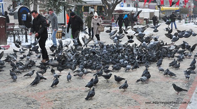 Edirne’de yaklaşık 1 haftadır etkili olan soğuk havadan dolayı güvercinlerin aç kaldığını belirten Edirne esnaflarından Fikret Yetiş, “ Kış ayların sert geçmesi nedeniyle güvercinler aç kalıyor. Durumlarını görüyorsunuz. Aç kalmasınlar diye güvercinlere buğday atıyorum” dedi.