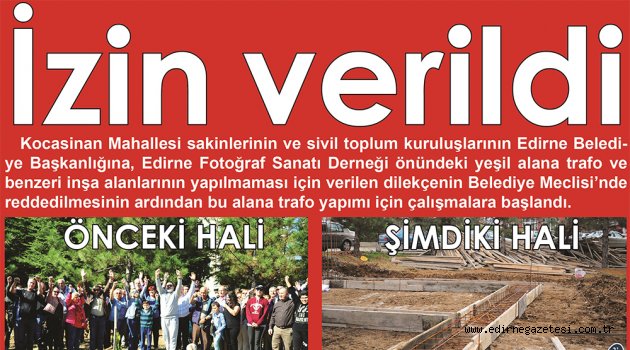 Kocasinan Mahallesi sakinlerinin ve sivil toplum kuruluşlarının Edirne Belediye Başkanlığına, Edirne Fotoğraf Sanatı Derneği önündeki yeşil alana trafo ve benzeri inşa alanlarının yapılmaması için verilen dilekçenin Belediye Meclisi’nde reddedilmesinin ardından bu alana trafo yapımı için çalışmalara başlandı.