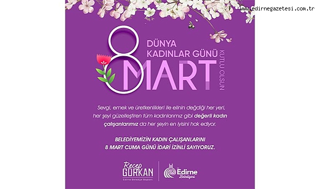 Edirne Belediye Başkanı Recep Gürkan, önceki yıllarda olduğu gibi bu yıl da geleneği bozmayarak, kadın çalışanların 8 Mart’ta idari izinli sayılması için talimat verdi.