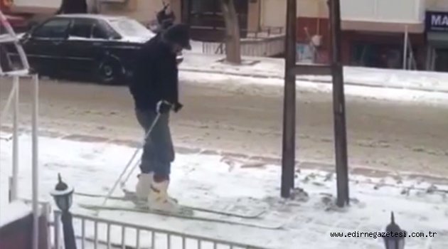 Edirne’de bir vatandaş kaldırımda kayak yaparak karın keyfini çıkardı. Kaldırımda kayak yapan kişi görenleri şaşkına çevirdi.