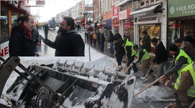 Edirne’de önceki gece yoğun kar yağışıyla Saraçlar Caddesi beyaza bürünürken, biriken kar kamyonlarla şehir dışına taşındı.
