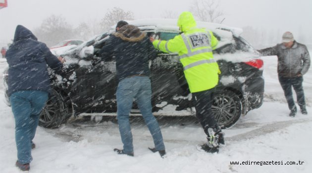 Edirne’de Cumartesi günü kar ve buzlanma nedeniyle birçok araç yolda kaldı. Araçların oluşturduğu uzun kuyruklar nedeniyle trafik adeta felç oldu. Olin kavşağı ve Devlet Hastanesi yolunda belediyenin kar temizliğinde yetersiz kalmasından dolayı yola çıkan araçlar yolda mahsur kaldı. İşlerine giden vatandaşlar da yürümekte zorluk çekti. Edirne Belediyesinin kar temizleme ekiplerinin kar yağışında yetersiz kalması vatandaşların tepkisine yol açtı. Vatandaşlar “ Belediye ekipleri yollarda çalışma yapmayınca polis ekipleri kendi imkânlarıyla yolları açtılar. Talatpaşa Caddesi, Vali Konağı Kavşağı, Esentepe mevki,Tunca Köprü girişi ve Kıyık Caddesi’nin temizlenmesinde yetersiz kalan Belediye karla mücadele de sınıfta kaldı” yorumunu yaptılar.BELEDİYEDEN SOKAĞA ÇIKMAYIN UYARISIAkşam saatlerine kadar cadde ve sokaklarda yol açma ve tuzlama çalışmasında yetersiz kaldığı gözlenen Edirne Belediyesi, vatandaşları ses yayın cihazından anonslar yaparak uyardı. Belediyeden yapılan anonsta kar lastiği olmayan araçların trafiğe çıkmaması istenirken, kapanan yollar nedeniyle belediyenin karla mücadele çalışmasını engellediği belirtildi.“SOSYAL MEDYADAN ELEŞTİRİ YAĞMURUNA TUTTULAR”Murat Ö., “Önlem kar yağmadan önce alınır. Meteoroloji 1 haftadır bas bas bağırıyor. Yollar bu hale gelmeden önlem alınacak. Geçen kış da farklı değildi. Başarısız insan bahane üretir, başaralı insan çözüm üretir”Şükran B. “Çarşıdan 3 saatte Şükrüpaşa Mahallesine geldik, bir tane belediye aracı ve çalışanı görmedik, herhalde görünmeden çalışıyorlar. Çalışıyorlardı da biz o kadar yolu neden bu kadar zamanda geldik farkında olmadan Çorlu’yu mu dolaşıp geldik”Necmi G. “Edirne belediyesi AKP’nin yardımcısıdır, Şuraya bakınız 5 santim buz ve tuzlama yok, çalışma yok, beyefendi ağaçlara ışık astı yılbaşına hazırlık yaptı, yazık çok yazık!”Onur Y. “Bağıra bağıra geliyorum diyen kar için hiç bir önlem alma, sonra yandaşlarla satılmışlarla güllük gülistanlık diye halkı kandır. Yılın oskarı ödülünü de vermeliler Başkana”Hayrettin İ. “Şuan itibariyle Edirne Belediyesi’nin bölgesinde sorumluluğunda olan yol açma çalışması karayollarına bağlı ekipleri tarafından yapılmaktadır. Bir kez daha belediye sınıfta kaldı, tebrikler. Edirne Belediyesi o kadar çok çalışıyor ki; ara sokakları bırak, ana caddeler kardan kapanmış durumda nokta”Özcan B. “Sayın Edirne Belediyesi muhtemelen Şehy Bedrettin heykeli inşaatı ile uğraşıyorsunuz, aksi takdirde yollar tuzlanır herkes evine rahat rahat giderdi.”Muhammet Ö. “15 cm karda Edirne trafiği felç oldu.10 km yolu 1,5 saatte gelebildim. Tebrikler Edirne Belediyesi. Gölette konser sahnesi hazırlayacağınıza yolları biraz temizleyin. Hala da daha bir ekibiniz yok ortada. Çok iyi bir hizmetkarsınız vesselam”Taner A. “Edirne'ye kar yağar, trafik felç, insanlar perişan yollar kapalı, Edirne Belediyesi ne iş yapıyor? Heykeli düşünene kadar Edirne'yi düşünmek gerek.Salim B. “Edirne Belediyesi çam ağacı süsleyip Noel kutlayacağına millete hizmet etsin hizmet. Yollar kar sebebiyle ulaşıma kapandı, nerde bu belediyenin iş makineleri, tuzlama araçları nerde bu belediyenin” İfadelerine yer verdiler.Mahsur kalan bazı vatandaşlar ise, polis ekiplerinin araçlarına bindirilip ana yollara çıkartıldı.