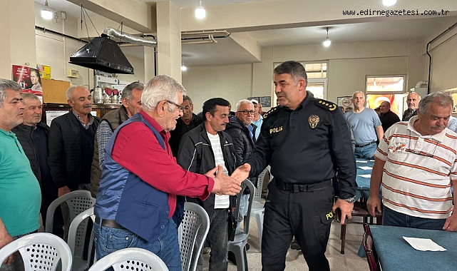 Edirne Emniyet Müdürü Onur Karaburun, İstasyon Mahallesi'nde düzenlenen Huzur Toplantısı'nda vatandaşlarla bir araya geldi.Karaburun, mahalledeki bir kahvehanede gerçekleştirilen toplantıda, asayiş ve huzurun sağlanması için yapılan çalışmalar hakkında bilgiler verdi.Mahalle sakinlerinin talep ve önerilerini dinleyen Karaburun, kentin daha huzurlu ve güvenli olması için çalışmalar yaptıklarını belirtti.Toplantıya, emniyet müdür yardımcıları, şube müdürleri, İstasyon Mahallesi Muhtarı Halit Paşa Yılmaz ve vatandaşlar katıldı.AA