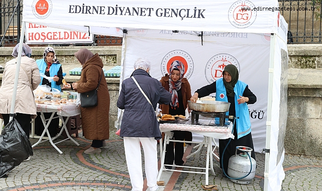 Türkiye Diyanet Vakfı Edirne Temsilciliği üyesi Kur'an Kursu kursiyerlerinin el emeği hazırladığı yiyecekler Eski Cami önünde vatandaşlara sunuldu.
