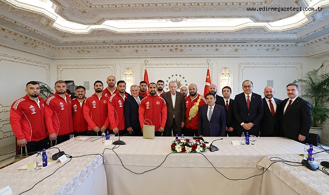 Cumhurbaşkanlığı Külliyesi’nde gerçekleşen kabulde, 664. Tarihi Kırkpınar Yağlı Güreşleri’nin yeni başpehlivanı Orhan Okulu, ikinci olan Feyzullah Aktürk ve farklı boylarda dereceye giren pehlivanlar da yer aldı.