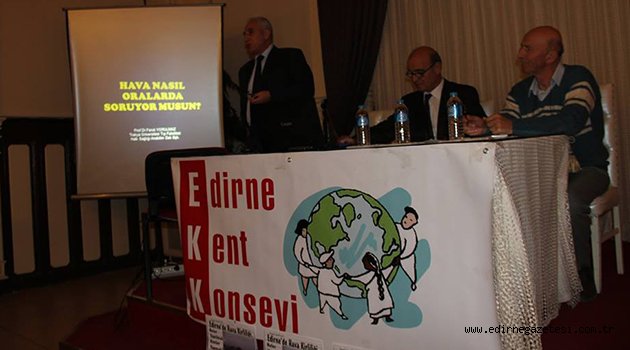 Nikâh Salonunu dolduran heyecanlı, mağdur ve duyarlı izleyicilerin dinlediği toplantıda kirlilik üzerine T. Ü. Halk Sağlığı Ana Bilim Dalı Başkanı Prof. Dr. Faruk Yorulmaz bir sunuş yaptı. Dünya Sağlık Örgütü’nün “temiz hava insan sağlığı ve refahı için en temel ihtiyaçtır” ilkesi doğrultusunda bir insanın günde 10-20 m3 havaya ihtiyacı olduğunu belirten Yorulmaz; insanın açlığa 60 gün, susuzluğa 6 gün havasızlığa ise sadece 6 dakika dayanabildiğini vurguladı. Edirne’de bir gün çekilen hava kirliliği fotoğraflarını da gösteren Yorulmaz, kirlilik nedeniyle geçmişte olan ölümleri ve kirlilik istatistiklerini belirtti.