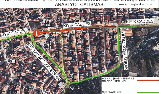 Edirne Belediyesi tarafından Kıyık Caddesi’nin, Şehit Yavuz Zogo Sokak ile Yıldız Köşk Sokak arasında kalan bölümünde altyapı çalışmaları başlatıldı. Çalışmalar kapsamında söz konusu güzergâh geçici süreyle araç trafiğine kapatıldı.