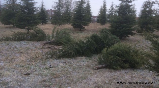 Barış Parkı civarında yer alan ve Edirne Belediyesi ile Orman İşletmi Müdürlüğü’nün destekleriyle oluşturulan koruluktan 4 adet ağaç kimliği belirlenemeyen kişi ve kişiler tarafından kesildi. Vatandaşların ihbarı üzerine olay yerine polis ekipleri konuyla ilgili araştırma başlattı. Edirne Belediyesi Park ve Bahçeler Müdürlüğü yetkilileri, ağaçları kesen kişi ve kişilerin, vatandaşların kendilerini fark etmeleri üzerine olay yerini terk ettiklerini belirterek, konuyla ilgili şikayetçi olunduğunu söylediler. Kesilen ağaçların Lübnan Sediri olduğuna dikkat çeken yetkililer, yaklaşık 10 yaşında olan ağaçların yılbaşı için kesilmiş olabileceğini belirtti. Konuyla ilgili soruşturma sürdürülüyor.