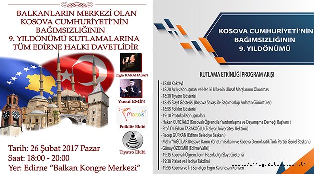 Edirne Valiliği, Edirne Belediyesi, Trakya Üniversitesi ile Edirne‘de faaliyet gösteren Kosovalı Öğrenciler Yardımlaşma ve Dayanışma Derneği’nin işbirliğiyle düzenlenecek olan kutlama programına Edirnelilerin yanı sıra Kosova’dan birçok bürokrat, siyasetçi ve iş adamı da katılacak. Kosova Cumhuriyeti’nin bağımsızlığının 9.yıldönümü etkinliği 26 Şubat Pazar günü saat:18.00’de Trakya Üniversitesi Balkan Kongre Merkezi’nde gerçekleştirilecek.