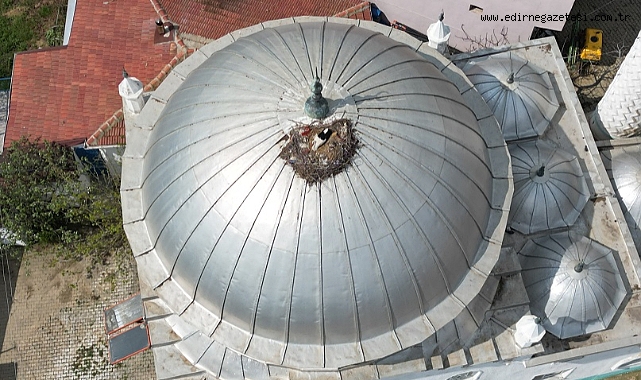 Leylekler 10 yıldır aynı cami kubbesine yuva yapıyor