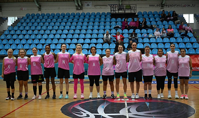 Edirne DSİ Basketbol Takımı sporcuları ve sağlık çalışanı kadınların da aralarında yer aldığı oyuncular, sahaya pembe formalarla çıktı.