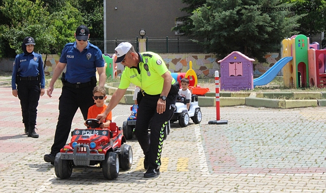 Süloğlu Anaokulu bahçesinde oluşturulan trafik parkında ekipler çocuklara trafikte güvenlik kurallarını uygulamalı olarak anlattı, öğrenciler akülü araçlarla sürüş gerçekleştirdi.