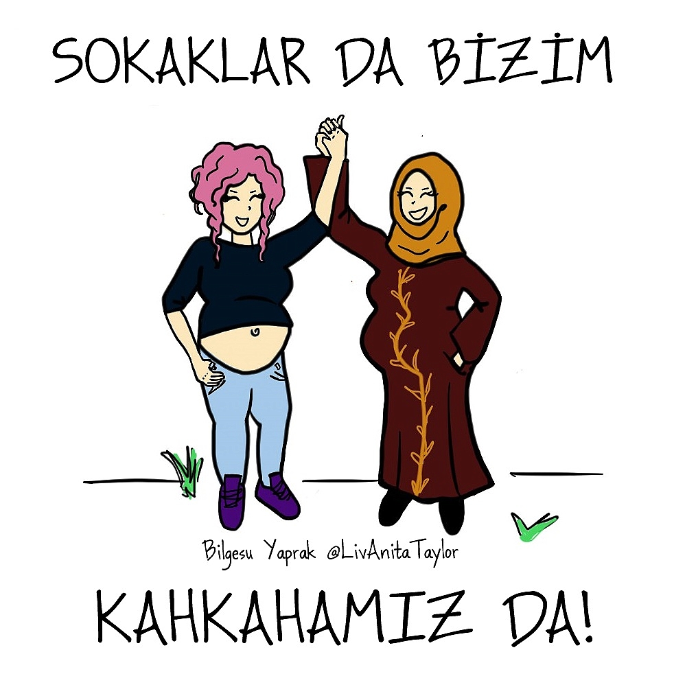 -Aslında o çizimim daha yeni gündem oldu. ‘Kıyafetime Karışma’ eylemleri ile bir şekilde gündem olan o çizimi aylar evvel hamile kadınlar ile ilgili yapılan bir açıklama üzerine çizmiştim. Hamile kadınların sokağa çıkmaması vs gibi açıklamalar üzerine çizmiştim. Çok talihsiz bir açıklamaydı bu. Bütünleyici, bütünleştirici ve kucaklayıcı bir yaklaşıma uygun çizmek istiyorum. Çünkü kendi görüşlerim bu yönde. Bu yüzden görselde tesettürlü bir hamile kadın ile marjinal diye sınıflandırılan (gülüyor) saç renginde ve giyimde bir hamile kadını düşündüm. Onların da el ele tutuşabildiğini, sokakların bizim olduğunu duyurmak için çizmiştim. Çizimim ‘kıyafetime karışma’ eylemi ile bir sembol haline geldi. Biraz şaşırtıcı oldu benim için ancak aynı şekilde büyük bir mutluluk verdi. İleride farklı projelerim olacak. Şu an ilüstrasyonlarımla daha çok ilgileniyorum. Bunun bu şekilde devam edeceğini düşünüyorum. En azından yerine daha iyi bir anlatma yolu olduğunu düşündüğüm bir şey bulana kadar. Çocuk kitapları resimlemek veya kitap kapakları resimlemek de bana keyif verebilir. Ticari kaygı gütmeyen, kadın hakları, hayvan hakları gibi konularda yapılan sosyal çalışmalara da katkıda bulunmaya her zaman devam etmeyi düşünüyorum. Maddi bir kaygı için tahminen yapılabilecek en son şeyi yapıyorum şuan (gülüyor).