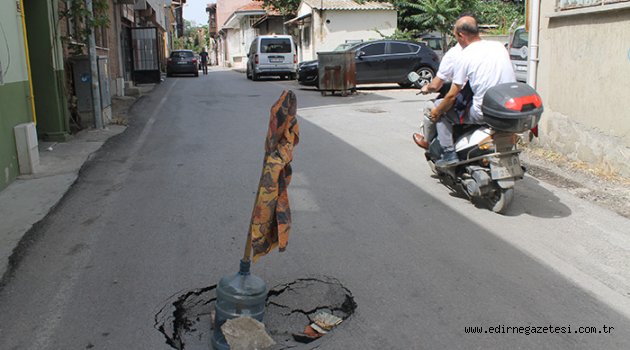 Kaleiçi semtinde çöken yola araçlar düşmesin diye uyarı levhası yerine su damacanasının içine dikilen bir sopa ve paçavra parçası bırakılarak önlem alınması “Türk usulü önlem” dedirtti.
