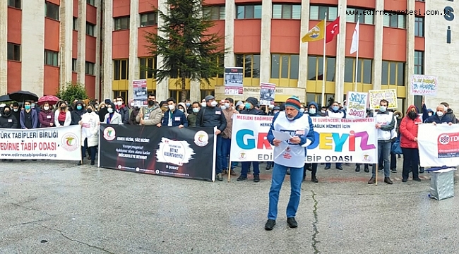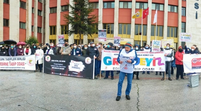 Trakya Üniversitesi Tıp Fakültesi Hastanesi önünde bir araya gelen sağlık çalışanları adına Edirne Tabip Odası Başkanı Prof. Dr. Gürcan Altun, açıklamalarda bulundu. Altun açıklamasında şu ifadelere yer verdi, “Sağlığı alınıp satılan bir meta, hastaneleri işletme, hastaları müşteri ve sağlık çalışanlarını köle olarak gören anlayışın yürürlüğe koyduğu sağlıkta dönüşüm programı ile, sağlık emekçilerinin emeği ucuzlatılmış, çalışma koşulları kötüleşmiş, halkın sağlık hakkı elinden alınmış, gelinen aşamada sağlık sistemi işlemez hale gelmiştir.
