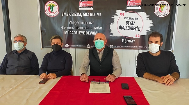 Edirne Tabip Odası Başkanı Prof. Dr. Gürcan Altun ve yönetim kurulu üyeleri, basın açıklaması gerçekleştirdi. Basın açıklamasında konuşan Edirne Tabip Odası Başkanı Prof. Dr. Gürcan Altun, şu ifadelere yer verdi, “Ekim ayında başlatılan eylemlik sürecinde sesimizi duyurmaya çalıştık. Hekimlerin yaşadığı sorunları dile getirdik. Kasım ayında İstanbul’dan başlayan beyaz yürüyüş, daha sonrasında Kocaeli, Bursa, Eskişehir ve Ankara’da sonlanan bu yürüyüşten sonra yapılan beyaz formla da bu sesi duyurmaya çalıştık. 15 Aralık’ta yaptığımız grev eylemi ile tüm ülkede sesimizi duyurmaya çalıştık. Ancak taleplerimizle ilgili nesnel bir gelişme olmadığı için yeniden Türk Tabipleri Birliği ve Tabip Odaları olarak 8 Şubat 2022 Salı günü ülkede tüm sağlık birimlerinde aile sağlığı merkezleri de dâhil olmak üzere grev iş bırakma kararı alındı. Bu süreçte hekimlerin sorunlarına dikkat çekmek için yine tekrar etmekte yarar var. Öncelikli olarak hekimlerin büyük çoğunluğunun maaşları yoksulluk sınırı altında kalmış durumda. Çok ciddi geçim kaygısı çekiyorlar. Çok riskli görevler yapan ve beraberinde uzun süreli görev yapan hekimlerin bir an evvel bu özlük hakları ile ilgili düzenlemelerin mutlaka yapılması gerekir. Pek çok hastanede döner sermaye ve nöbet ücretleri ödenmiyor. Ülkemizde ne yazık ki hemen her gün bir sağlık kurumunda sağlık çalışanları ve hekimlerinin şiddet haberi ile karşılaşıyoruz. En temel taleplerimizden birisi sağlıkta şiddeti önleyecek tarzdaki bir yasal düzenlemenin en kısa sürede çıkarılmasıdır. Emekli hekimlere yönelik de ortak bir düzenleme yapılması gerekiyor. En temel taleplerimizden birisi de Kovid-19 başta olmak üzere bir meslek hastalığı yasasının çıkarılmasıdır. Kovid-19 salgını nedeniyle çok ciddi kayıplar yaşandı bunların arasında sağlık çalışanları da yer alıyor. Bunlar için mutlaka Kovid-19’un bir meslek hastalığı olarak kabul edilmesi gerekiyor.