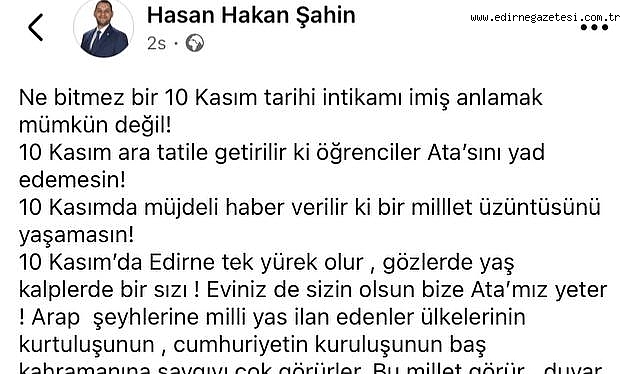 Edirne’nin tepkisini de vurgulayan Şahin, “10 Kasım’da Edirne tek yürek olur, gözlerde yaş kalplerde bir sızı. Eviniz de sizin olsun bize Ata’mız yeter” dedi. Şahin, paylaşımında ayrıca “Arap şeyhlerine milli yas ilan edenler, ülkenin kurtuluşunun ve cumhuriyetin kuruluşunun baş kahramanına saygıyı çok görürler” diyerek eleştirisini sürdürdü ve son olarak seçmenleri uyarıp şu ifadeyle paylaşımda bulundu; “Bu millet görür, duyar ama konuşmaz. O sandık geldiği gün gideceksiniz hem de bir daha gelmemek üzere” HABER MERKEZİ