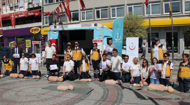 Edirne İl Sağlık Müdürlüğü Acil Sağlık Hizmetleri ekipleri, İlkyardım Haftası kapsamında Saraçlar Caddesi’nde maketler üzerinde halka ilkyardım müdahalesini anlattı.